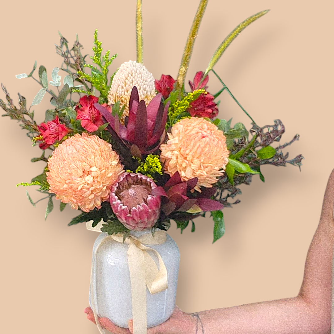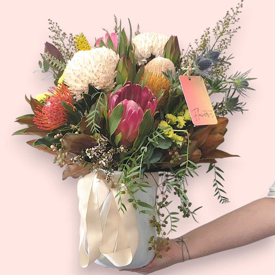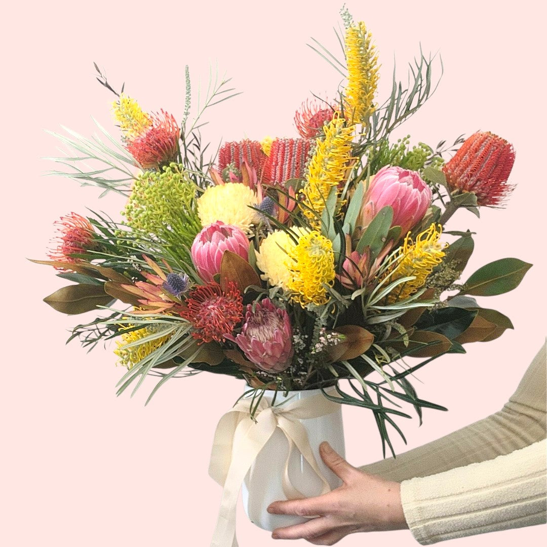 Australiana is our ode to country combo, inspired by Aussie's everywhere! Long lasting native and wild flowers mixed with seasonal blooms, designed by Bribie Island Flower Co